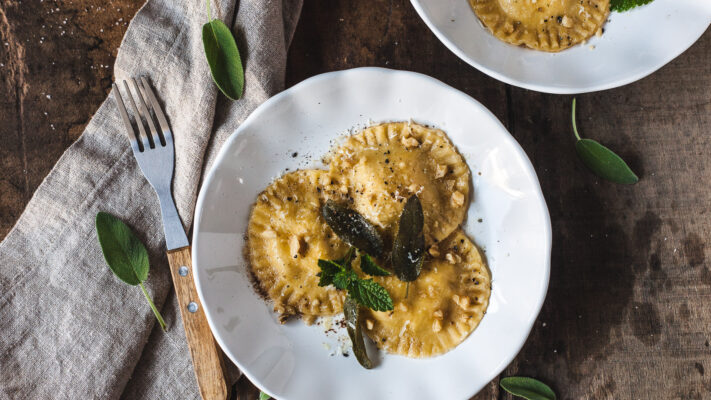 Domači ravioli z dimljeno ovčjo skuto, orehi in pocvrtim žajbljem